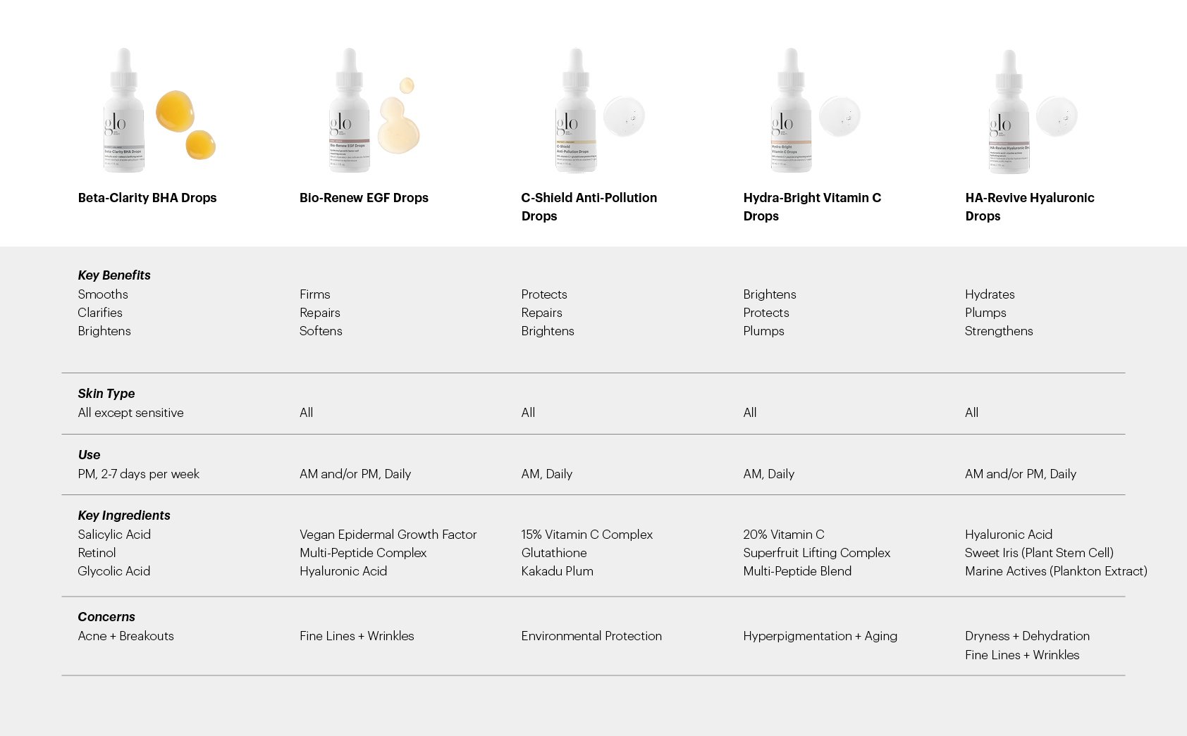 Not sure what face serum to start with? For an essential dose of hydration and antioxidant skin-defense, our best-selling C-Shield Anti-Pollution Drops and HA-Revive Hyaluronic Drops make the perfect daily duo, delivering big on brightening and skin strengthening with vitamin C and hyaluronic acid. Glo’s face serums are super versatile and easy to personalize, whether you choose to layer them into your daily ritual as day or evening treatments, you can use your serum full-strength—4-6 drops, and apply across the face and décolleté for maximum benefits. Add 2-3 drops to spot-treat concerns, or add 2-3 drops to supercharge a moisturizer, primer, or foundation.